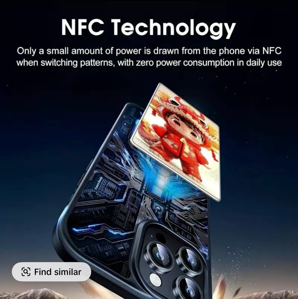 Answer 1: This phone case features a unique NFC function and an E Ink screen that allows for personalization, showcasing designs or cartoon characters without the need for batteries.